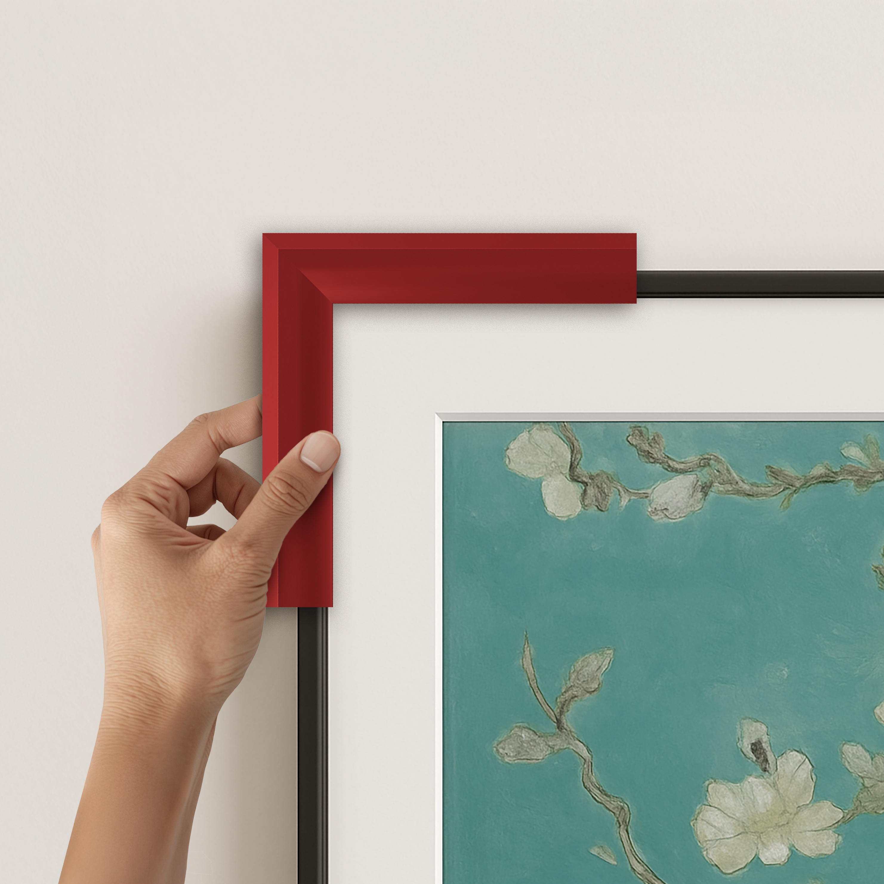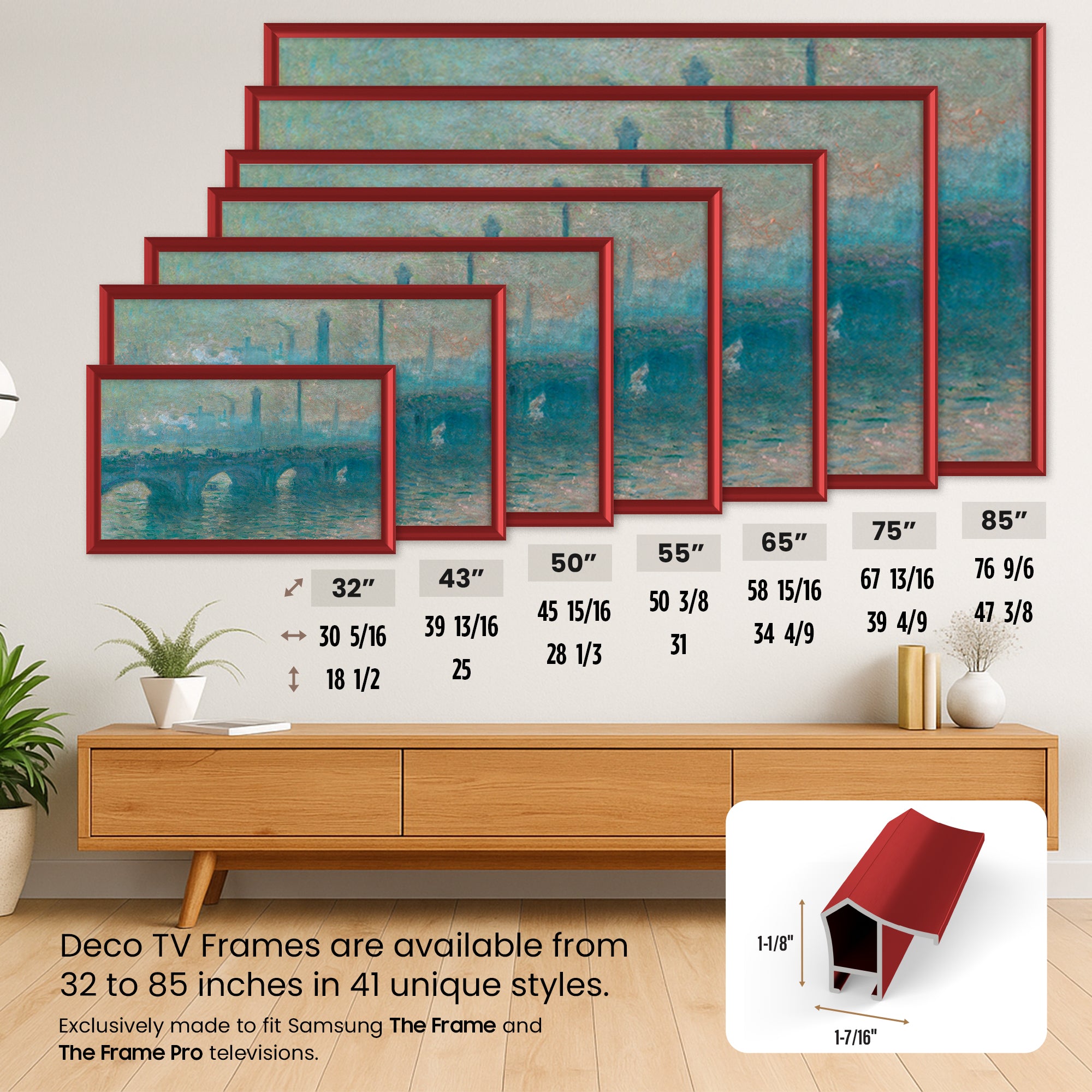 Each frame hooks onto the top of your Samsung Frame television and clips into place at the bottom to perfectly align with the edge of the TV screen. All frames can be easily installed by any consumer with no technical knowledge.