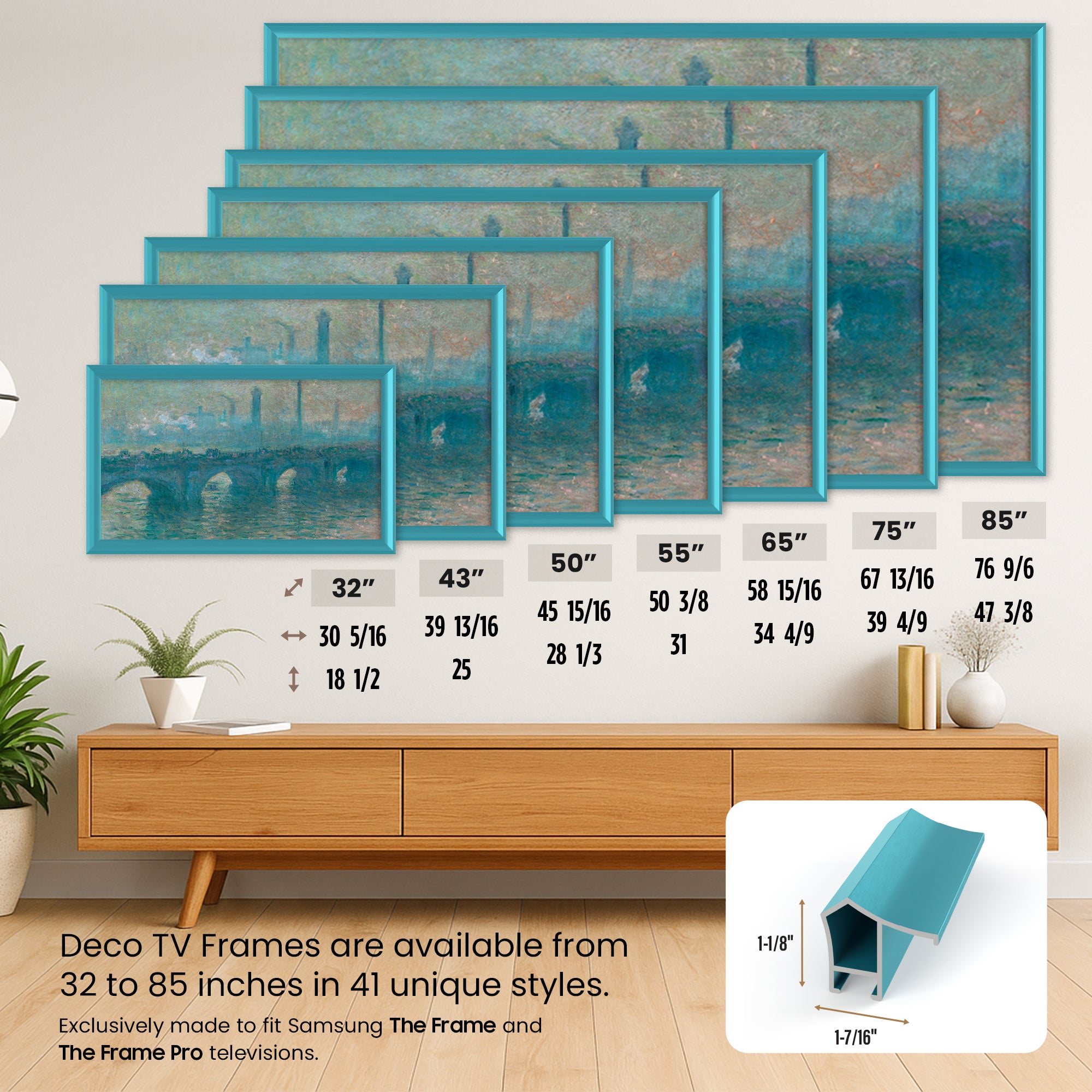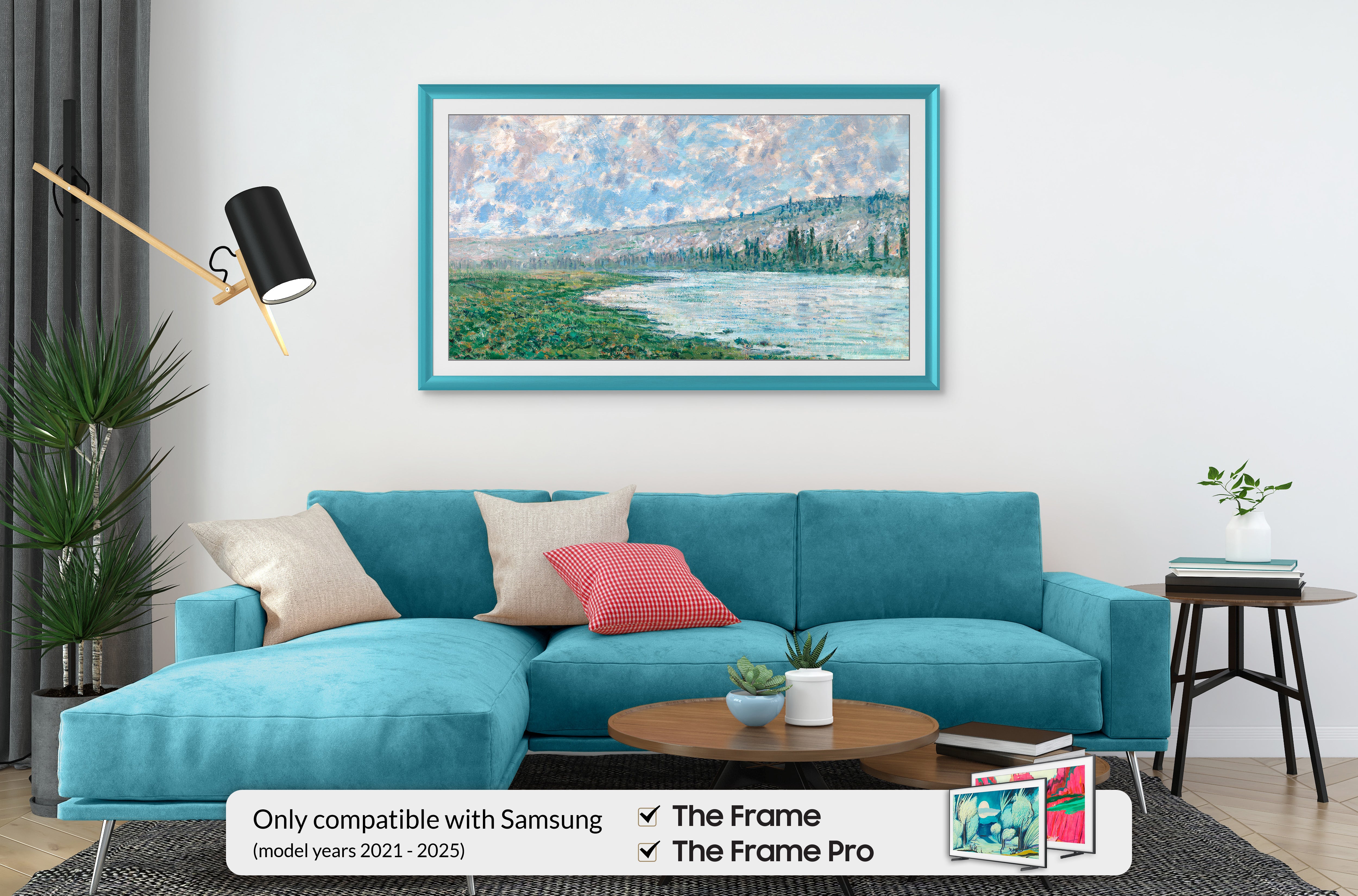 Each frame hooks onto the top of your Samsung Frame television and clips into place at the bottom to perfectly align with the edge of the TV screen. All frames can be easily installed by any consumer with no technical knowledge.