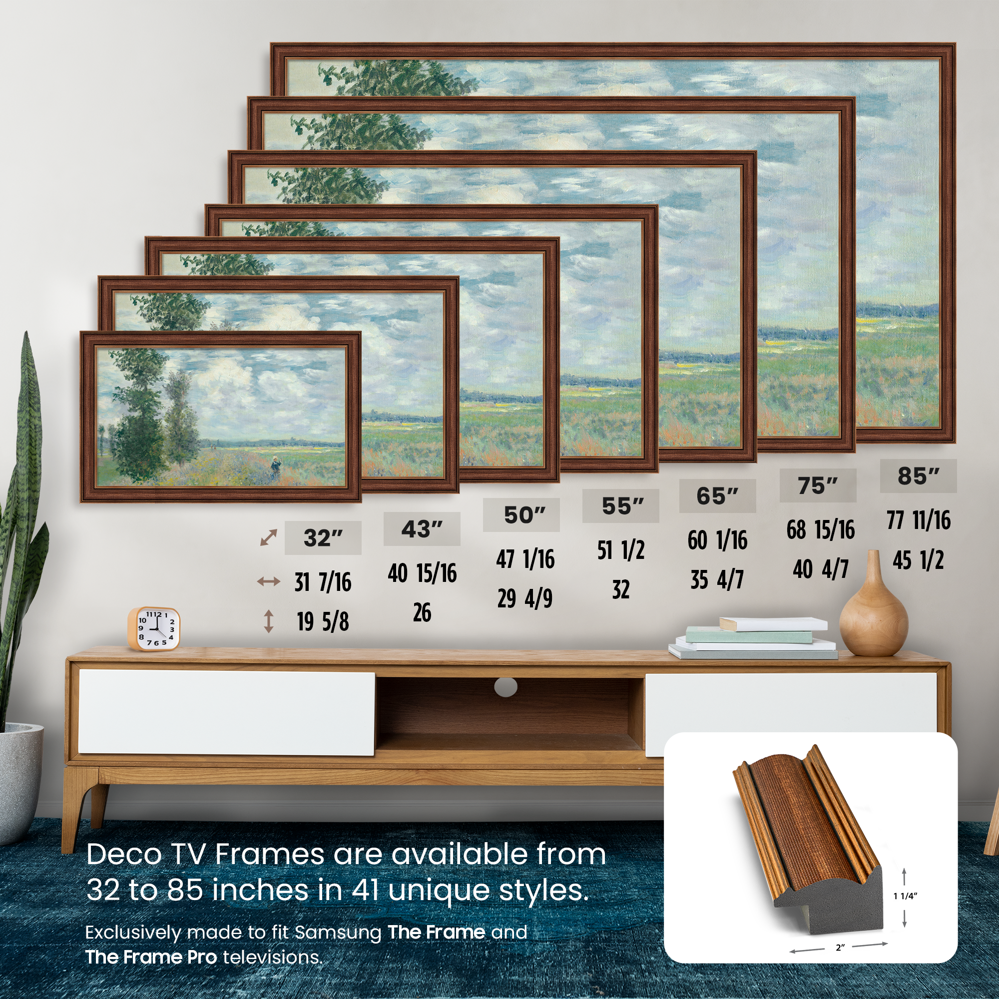 Get a real-life sample to review the color options for Deco Slim TV Frames that work with Samsung The Frame Televisions! Color: Copper Width: 2"