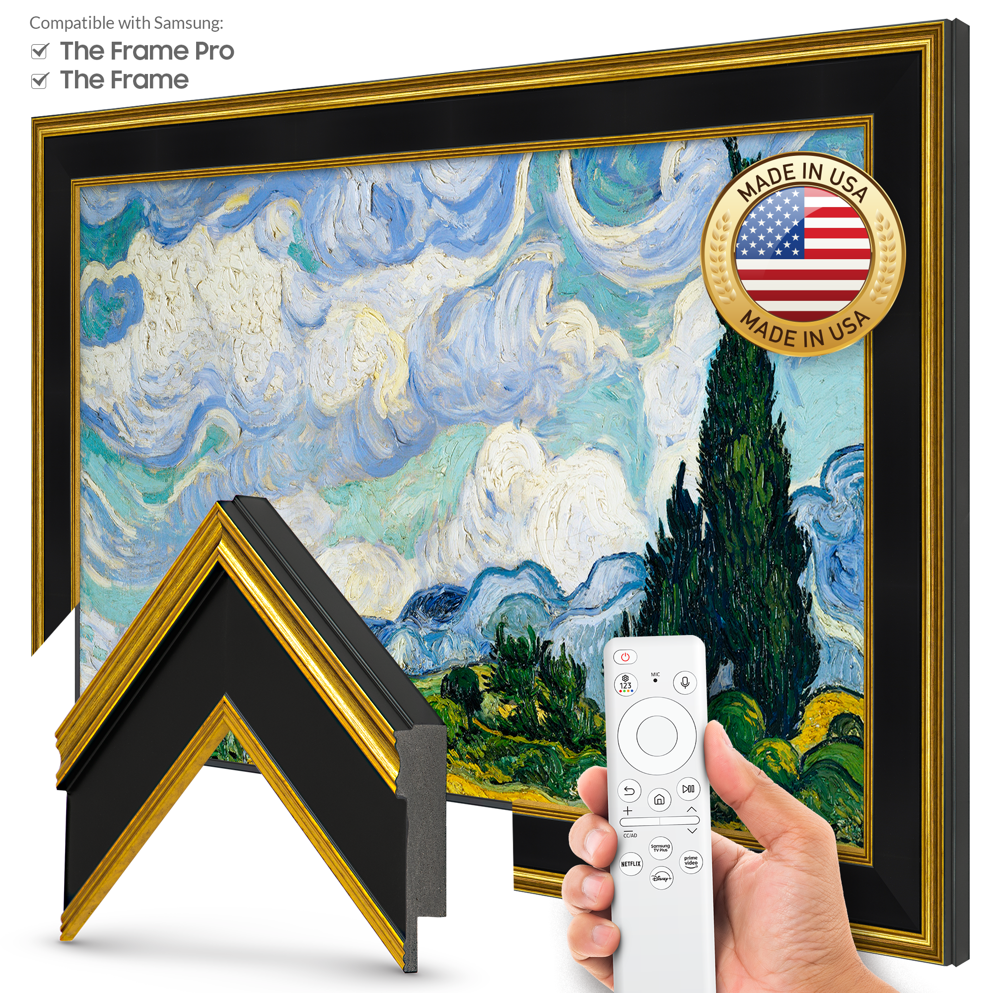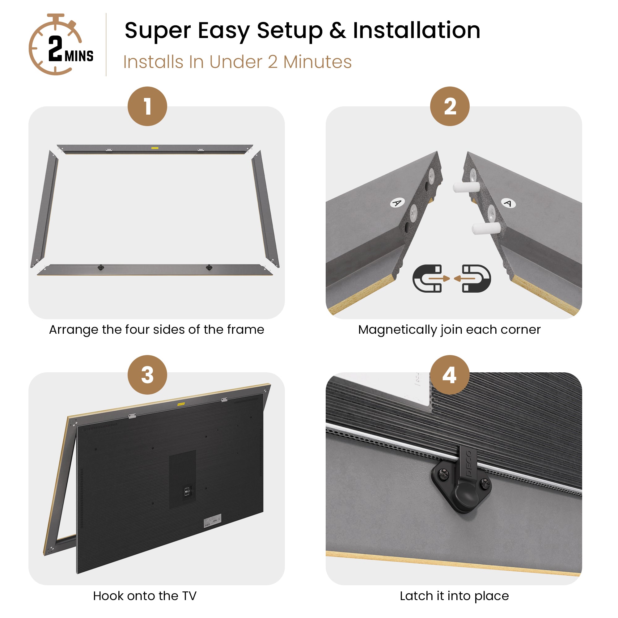 This premium decorative TV frame is made to perfectly fit any size Samsung Frame TV. The frame ships directly to you in four easy to assemble pieces and can be snapped together and fully attached to your Samsung TV in under 2 minutes.