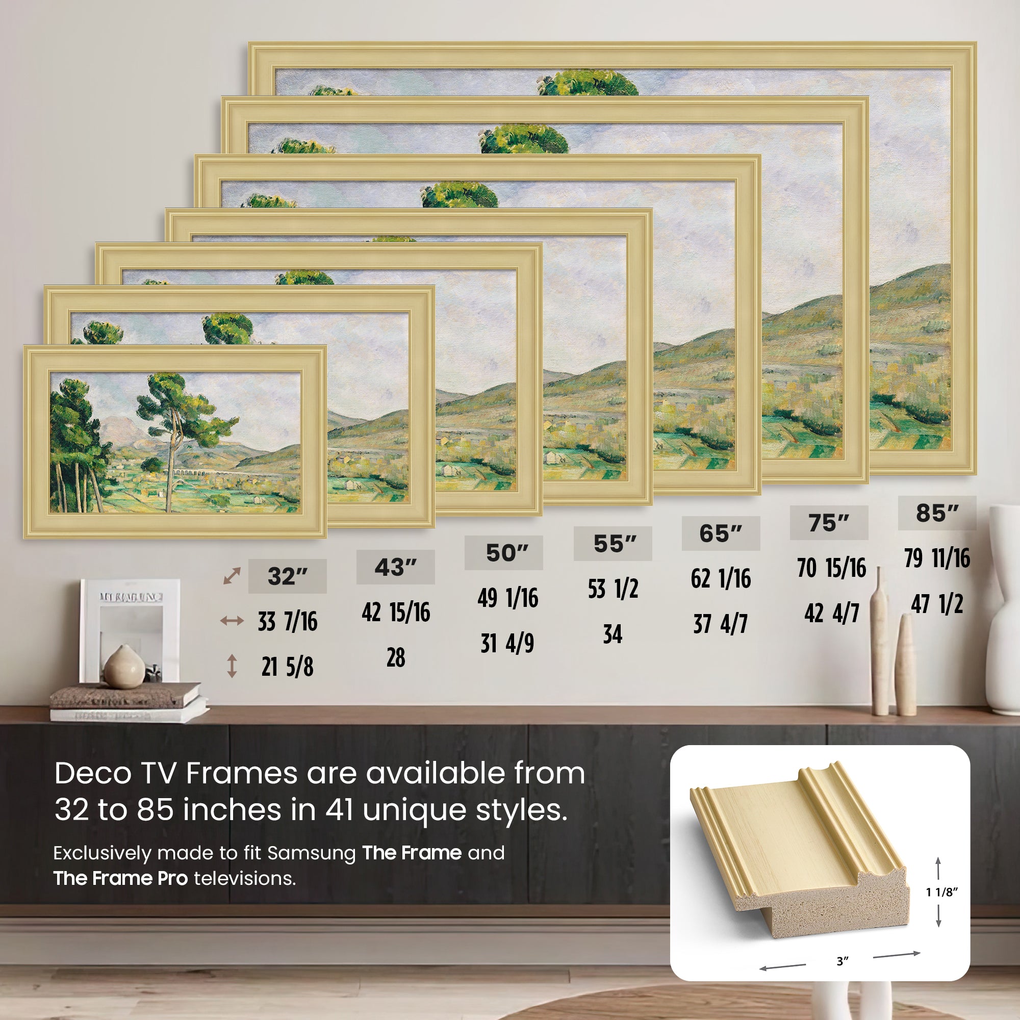 This premium decorative TV frame is made to perfectly fit any size Samsung Frame TV. The frame ships directly to you in four easy to assemble pieces and can be snapped together and fully attached to your Samsung TV in under 2 minutes.