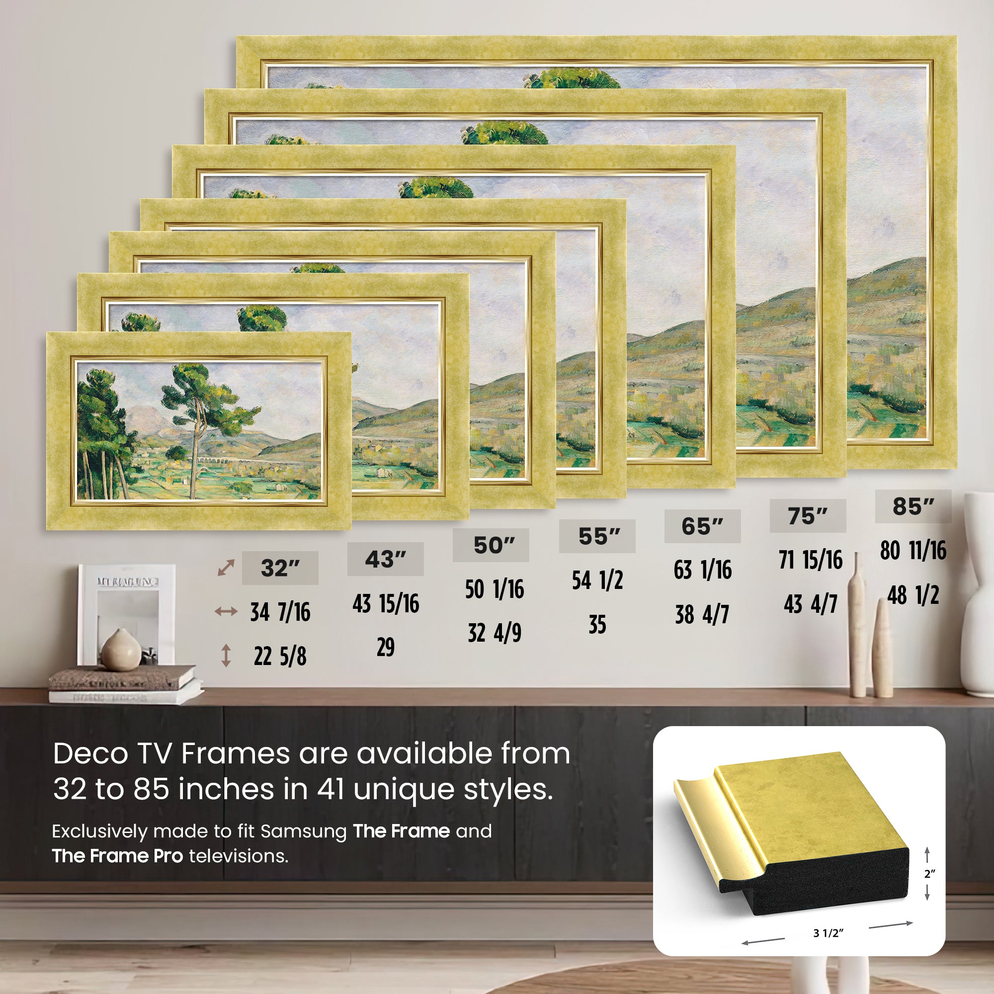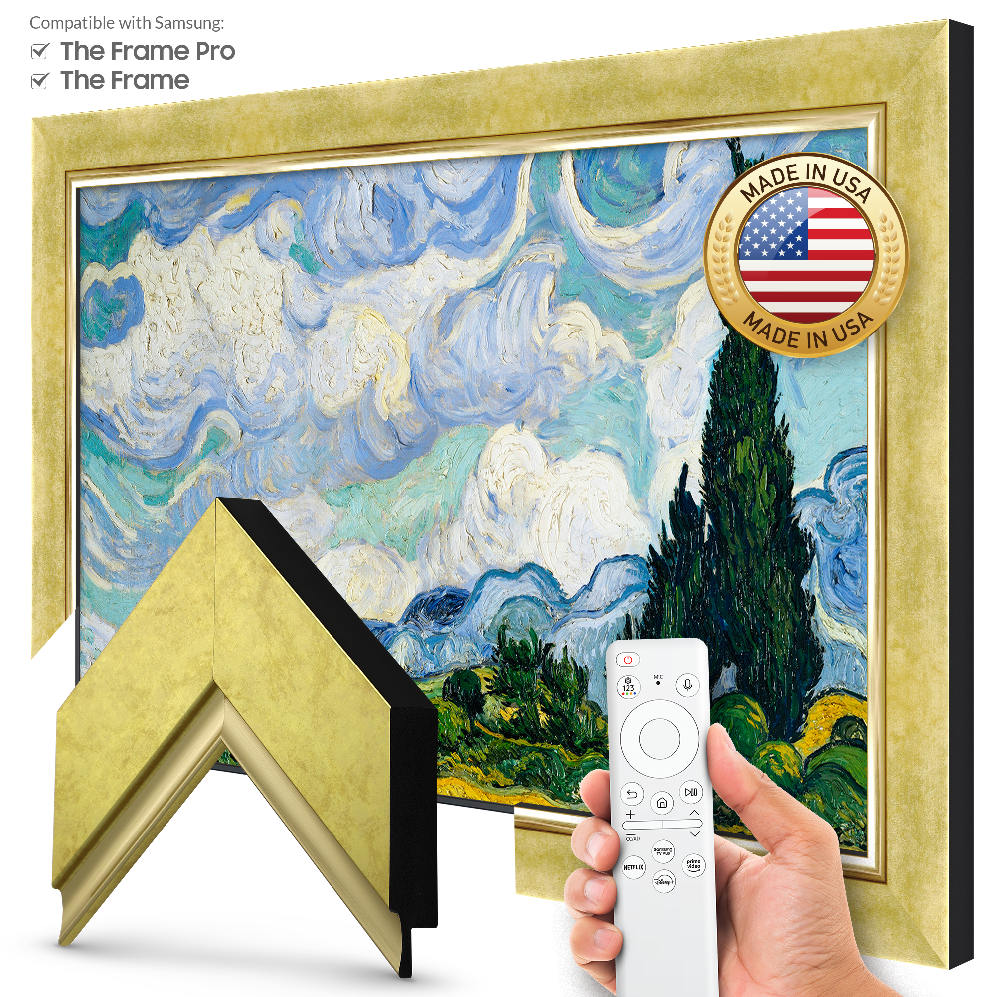 This premium decorative TV frame is made to perfectly fit any size Samsung Frame TV. The frame ships directly to you in four easy to assemble pieces and can be snapped together and fully attached to your Samsung TV in under 2 minutes.