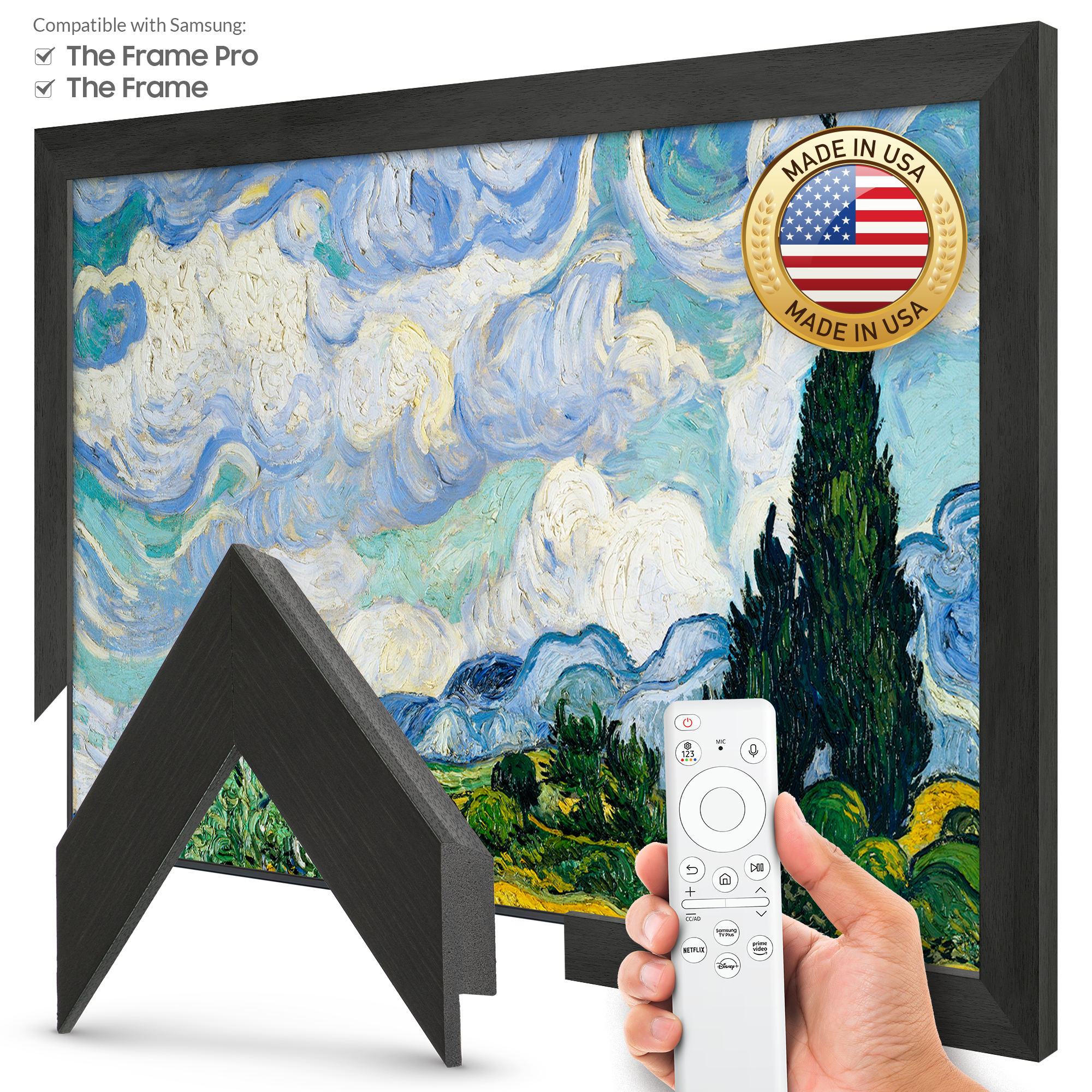 Each frame hooks onto the top of your Samsung Frame television and clips into place at the bottom to perfectly align with the edge of the TV screen. All frames can be easily installed by any consumer with no technical knowledge.