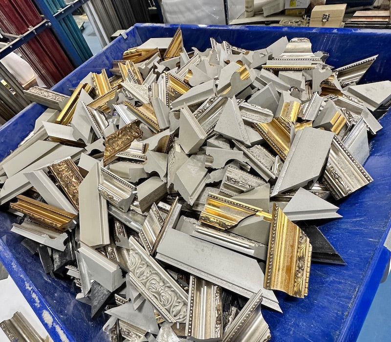 With the shift to sustainable mouldings, not only have we reduced waste in the manufacturing process by 90% ... but also this waste is now recyclable as well. Even the waste shown here is fully recycled back into more moulding! No longer will our wood moulding waste be headed to landfills!