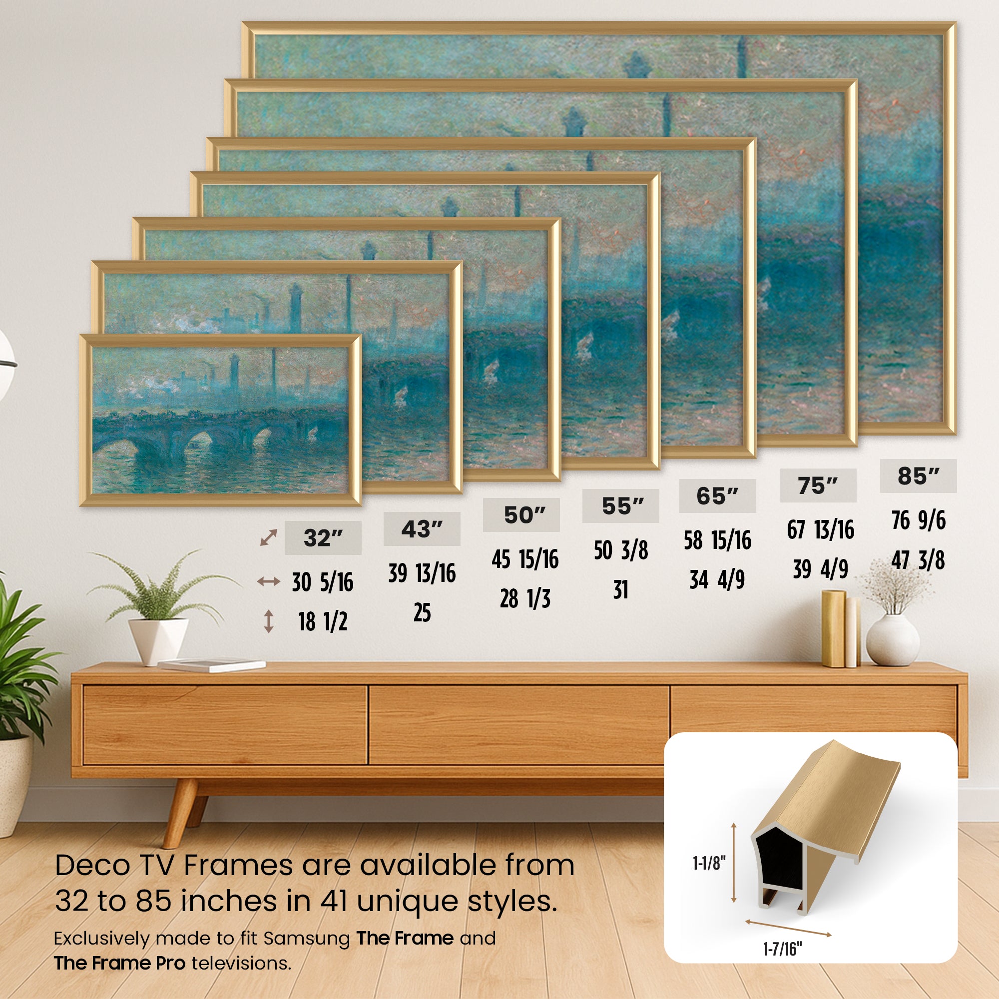 Each frame hooks onto the top of your Samsung Frame television and clips into place at the bottom to perfectly align with the edge of the TV screen. All frames can be easily installed by any consumer with no technical knowledge.